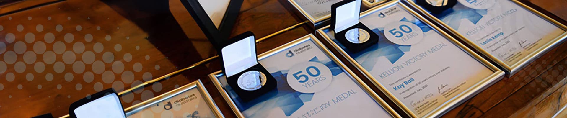 Kellion Victory Medal Each year Diabetes Australia presents the Kellion Victory Medal to those who have lived with type 1 or type 2 diabetes for 50 years or more. It recognises the achievement of living a fulfilling life with diabetes. Recipients also receive a certificate. Silver – 50-year medal Gold – 60-year medal Platinum – 70-year medal Diamond – 75-year medal Pearl – 80-year medal Ruby – 85-year medal Lapis – 90-year medal Emerald – 95-year medal Centennial – 100-year medal. Meet the Kellion Victory Medal recipients. How to apply Be part of diabetes research Kellion Diabetes Foundation Kellion Supporters Award A further addition to the Kellion Victory Medals Scheme is the Kellion Supporters Award. Having diabetes affects the whole family. Supporters and carers play a major role in assisting a person with diabetes to live a full and satisfying lifestyle; the Kellion Supporter’s Award recognises many years of love, dedication and support. Governor of Tasmania, the Honourable Barbara Baker, with recipients at a presentation of the 2022 Kellion Victory Medals Who is eligible? All Australians who have been living with diabetes for 50 years or more are eligible for a Kellion Award. These people may have either type 1 or type 2 diabetes. For more information on eligibility for a Kellion Supporter’s Award contact Diabetes Australia. How do you apply? Diabetes Australia encourages doctors, other healthcare professionals, and diabetes associations and support groups to nominate likely recipients. Complete the application form Make a nomination by filling out the Kellion Victory Medal Application Form. The form must be completed in full. Substantiating information is not always easy to obtain and proposers are asked to assist by providing copies of records such as date of diagnosis or initial hospital admission where possible. Submit the application You can submit the application either by email to [email protected] OR delivered to the state or territory office for processing together with substantiating information. Be a part of important diabetes research As part of our ongoing commitment to invest in research that connects lived experience with health expertise, Diabetes Australia has partnered with researchers around the country to investigate what makes our Kellion Victory Medallists so special. Professor Stephen Twigg, of the University of Sydney and Royal Prince Alfred Hospital will be coordinating research in NSW and other states to determine what physical, biological, and lifestyle characteristics have kept our Medalists happy and healthy for so many years. To do this, the research team at the University of Sydney and Royal Prince Alfred Hospital need people who have received a Kellion Victory Medal to volunteer to be interviewed and assessed. This is done at a weekday 3-hour visit at the clinic located at Charles Perkins Centre, Johns Hopkins Drive, Camperdown NSW 2050. If you would like to know more about what is involved in participating, please contact the Research Coordinator directly on the contact details below, and they can discuss the study in more detail with you. Research Coordinator: James Gerofi Email: [email protected] Phone: 02 8627 1927 Kellion Diabetes Foundation The Kellion Diabetes Foundation has donated well in excess of $1 million towards diabetes research. The Kellion Victory Medal honours both father Claude and son John, and is a lasting tribute to their name. Before his death, Claude Kellion also established a Chair in Diabetes at the University of Sydney which was filled by Professor John Turtle (it is now occupied by Dennis Yue). Insulin was first administered to a human patient in January 1922. Fifty years later, in 1972, The Joslin Clinic Foundation in Boston, Massachusetts established a Victory Medals Scheme, known as the Joslin Victory Medals Scheme, and people from all over the world could apply – but by 1982, the numbers became so great that awards were limited to residents of USA. In 1984, Diabetes Australia responded to a proposal by Dr Alan Stocks to recognise and commemorate Australians for having survived with diabetes for 50, 60 and 70 years or more. In view of his outstanding contribution towards diabetes in Australia, the late Mr Claude Kellion AM was invited to have his name associated with the scheme, to which he graciously consented. Mr Kellion made an outstanding contribution towards diabetes in Australia following the untimely death of his son, John in September 1972. At just 38 years of age, John died as a result of complications of diabetes. Dismayed by the lack of research into diabetes and its complications, Claude Kellion decided to set up the Kellion Diabetes Foundation with the aim of funding research and education into diabetes. For many years this foundation was the only private source of funding for diabetes research in Australia.