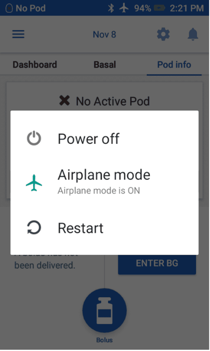 Battery depletion on the Omnipod DASH® PDM 9 November 2024 Omnipod users in Australia are being advised to put their DASH Personal Diabetes Manager (PDM) on airplane mode, following reports of battery depletion. Insulet is aware of, and closely monitoring, customer feedback regarding instances where the Omnipod DASH® PDM battery is draining quickly. On 9 November 2024 Insulet sent out advice to Omipod users to take the following action to address the issue. This action does not affect the function of the Omnipod DASH® PDM: Activate Airplane Mode on your PDM in accordance with the User Guide. How to turn Airplane Mode on: Press and hold the Power button until a screen appears with Airplane Mode option Tap Airplane Mode to toggle it to ON, as shown in the screen below As always, ensure you have a backup insulin delivery plan in place in case of emergency. If you have any questions, please call the customer support team on 1800 954 074. Frequently Asked Questions Q: How do I know if I have an affected PDM? A: If you notice that your PDM’s battery is draining more quickly than normal, then you might have an affected device. Q: What should I do if my PDM’s battery depletes completely? A: Your first step should be to charge the PDM and have backup insulin delivery available if needed. Q: If I have an impacted PDM, will I receive a replacement? A: Please contact customer care to discuss your situation and possible options. We will provide more information as soon as it’s available. Q: When will Insulet fix this issue? A: We are investigating the issue to help us identify and resolve the issue, and will provide more information as soon as it’s available. Q: Are the batteries in my Pods impacted? A: No. Pods will continue to deliver basal insulin even when the PDM is powered off or if the PDM battery is depleted.